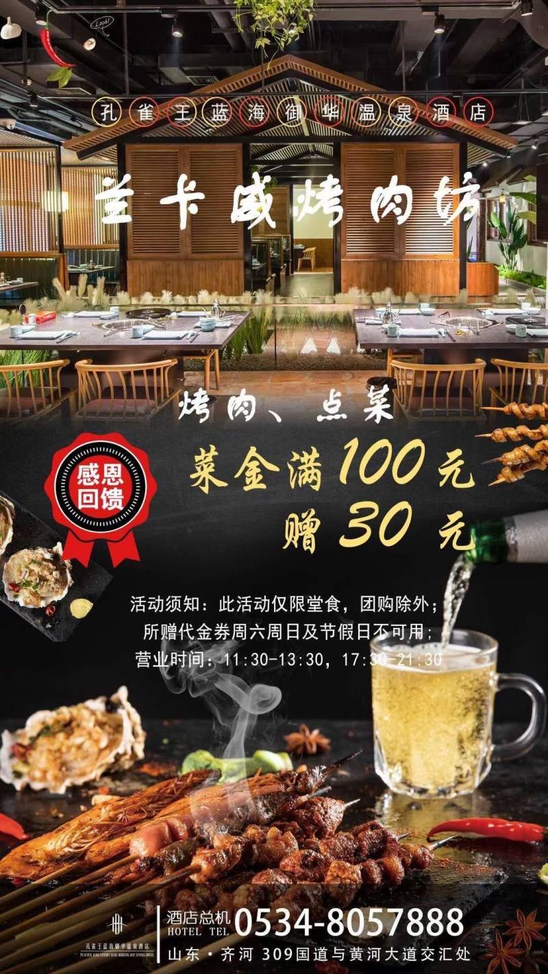 兰卡威烤肉坊菜金满100元赠30元