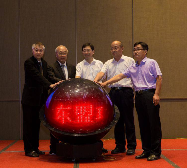 印尼工商会馆中国委员会副主席张锦泉先生、中国东盟商务协会总会总会长丹斯里林玉唐先生、德州市贸促会副会长张建华先生、齐河县商务局局长宋善炎先生、齐河县工信局副局长黄吉辉先生共同按动启动球庆祝德州-东盟项目中心网络平台成功上线